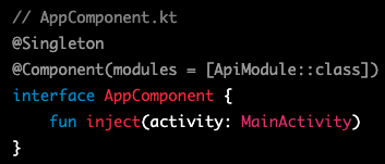* DaggerAppComponent는 Dagger lib에서 자동으로 생성되며, 이름 규칙은 "{Dagger$@ComponentInterfaceName}
